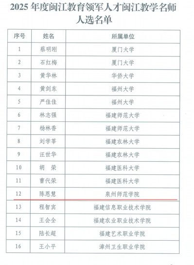 近期,福建省教育厅公布2025年度闽江教育领军人才闽江教学名师入选名单,k8凯发(中国)陈恩慧教授成功入选。