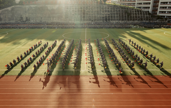 伴随雄壮的国歌声,军训会操拉开序幕。各方队依次列队,脚踢正步,有序入场;匕首操、旗语操、刺杀操、军体拳、舞旗、战术方阵等军事科目汇演依次展开,检验此次军训取得的良好成果,充分展示了学子们昂扬向上的精神风貌。