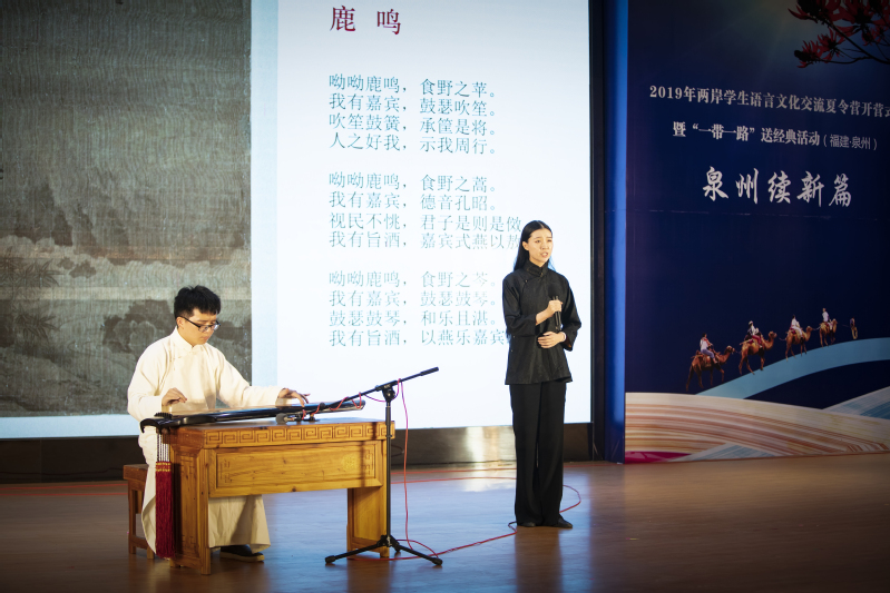 On the morning of July 6th, the Opening Ceremony of 2019 Language & Culture Communication Summer Camp for Students on Both Sides of the Taiwan Straits and “The Belt and Road” Chinese Classics Donation Ceremony were held in No.1 Academic Hall of Special Education Block in Quanzhou Normal University. More than 300 people attended the activity, including Tian Lixin, Director of Department of Language Application & Administration and Department of Language Information Management of the Ministry of Education, Li Xun, Deputy Director of Education Department of Fujian Province, Xiao Hanhui, Vice-Mayor of Quanzhou Municipal Government, Huang Qiang, Party Secretary and Director of People's Education Press, Fang Ming, General Counsel of Chinese Classics Database, Broadcasting Instructor of China Media Group and a famous recital artist, Zhu Shize, Party Secretary of QNU, Qu Guangqing, President of QNU, officials from Department of Language Application & Administration and Department of Language Information Management, Work Committee for Taiwan and Overseas Chinese of the Standing Committee of Fujian Provincial People's Congress, Education Department of Fujian Province, People's Education Press, Quanzhou Municipal Government, Straits Publishing & Distributing Group of Fujian Province, Quanzhou Education Bureau, heads of the relevant functional departments of QNU, and teachers and students of the summer camp. The opening ceremony was hosted by Huang Jiangkun, Vice President of QNU.