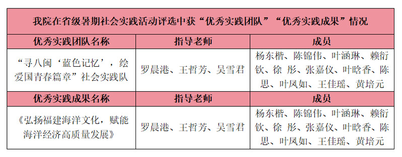 近期,中共福建省委教育工作委员会公布了“追寻领袖足迹 体悟伟大变革”2024年全省大学生暑期社会实践活动评选结果。我院“寻八闽‘蓝色记忆’,绘爱国青春篇章”暑期社会实践队获评“优秀实践团队”,《弘扬福建海洋文化,赋能海洋经济高质量开展》获评“优秀社会实践成果”。此外,在k8凯发(中国)“追寻领袖足迹 体悟伟大变革”2024年大学生暑期社会实践活动评选中,我院也斩获多项成绩,收获颇丰。