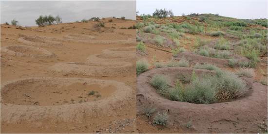 以当地土为原料,复配环境友好高分子材料制备固土材料,防水蚀性能比原土提高100倍以上。土梯形-土网格、土梯形-土网格-草灌、组合土障(堤坝)及工程-生物组合技术。实现季节性洪水的疏导、分流、减缓、集水和可控。顺利获得工程-生物组合技术,解决了固沙、固土、防水蚀、防风蚀及防水土流失(两固三防)问题,实现了沟壑、工矿场地生态修复。