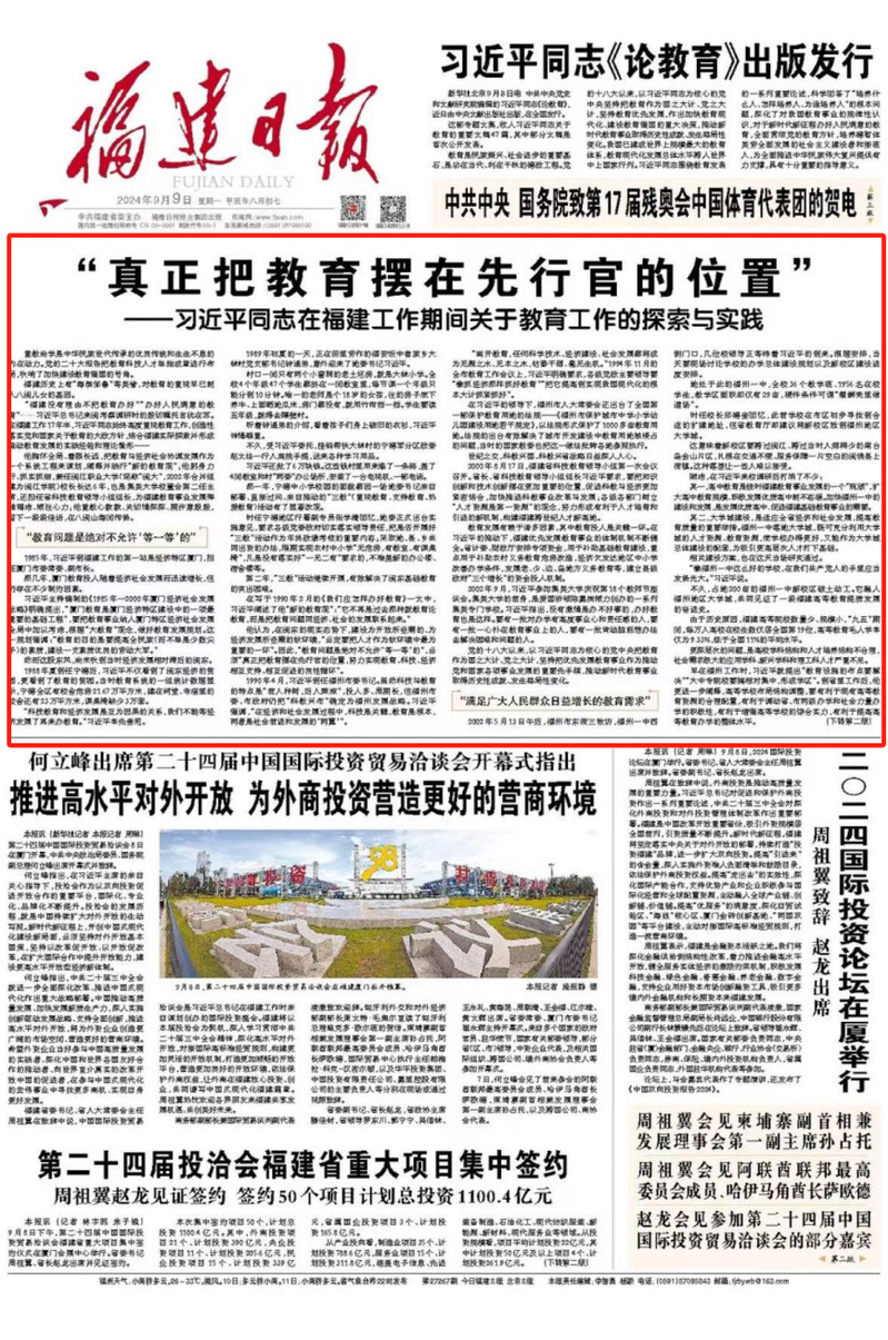 福建是习近平新时代中国特色社会主义思想的重要孕育地和实践地。近年来,福建日报社持续担当作为,带着感情、带着责任,深挖阐释理论富矿,推出“习近平同志在福建工作期间的探索与实践”系列报道。今天,《福建日报》一版和二版刊发《“真正把教育摆在先行官的位置”——习近平同志在福建工作期间关于教育工作的探索与实践》,全文如下,一起学习: